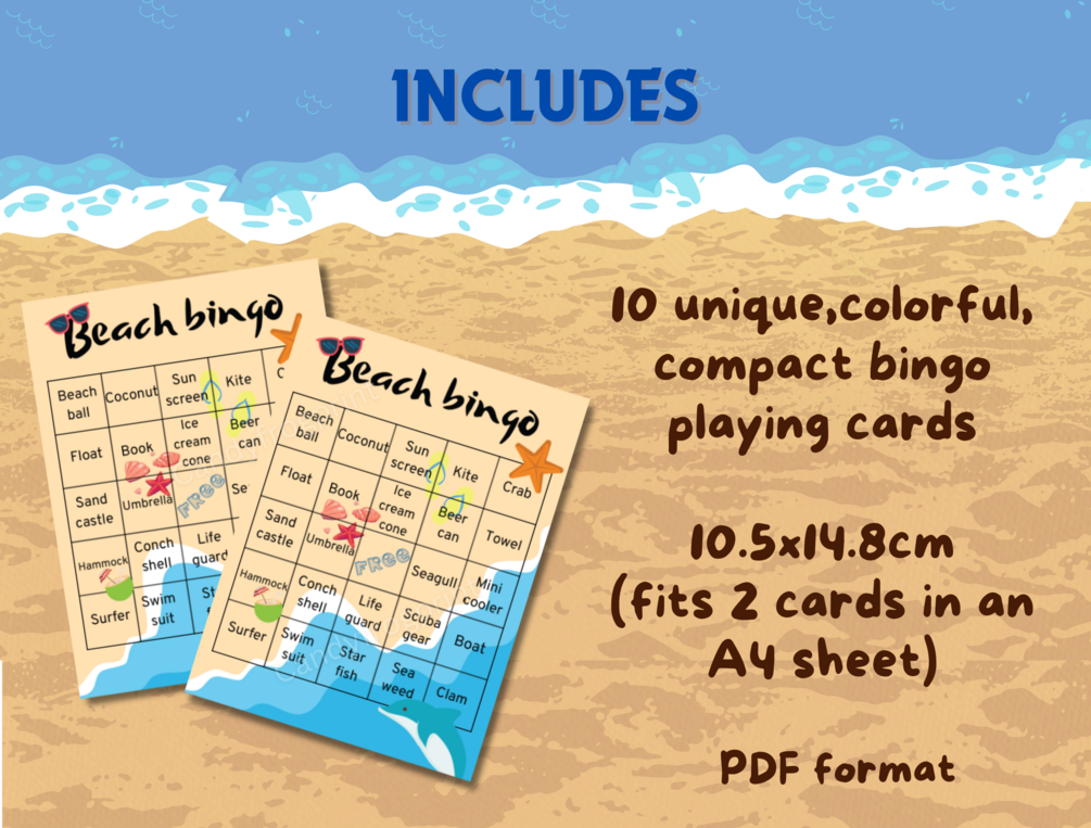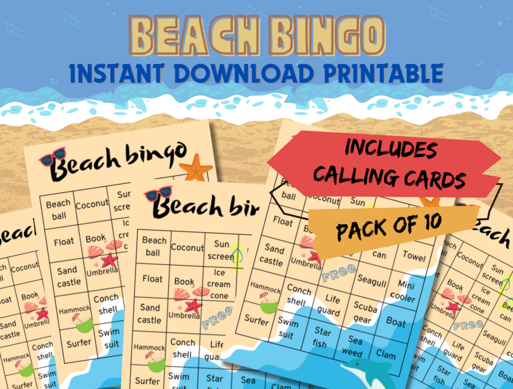Beach themed bingo set including 10 unique game cards and one sheet of calling cards, instant download printable