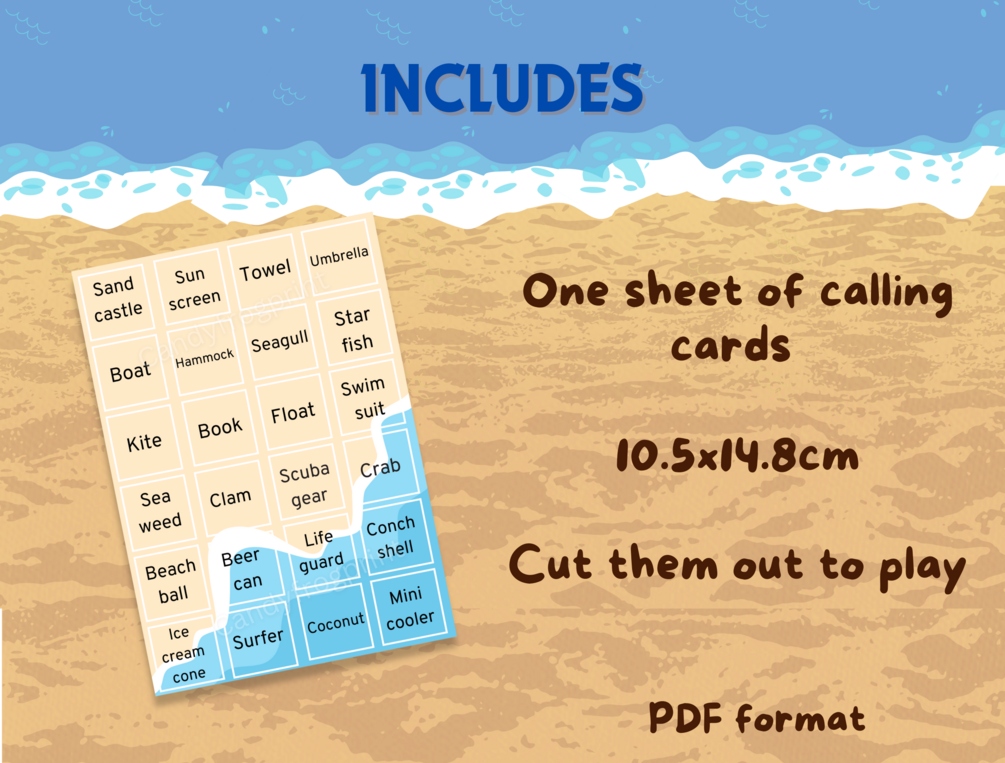 While this set does include calling cards to play regular bingo, we have put thought into including items that are actually spottable on a beach trip, so you can go scavenger hunting AND callout a bingo at the same time!