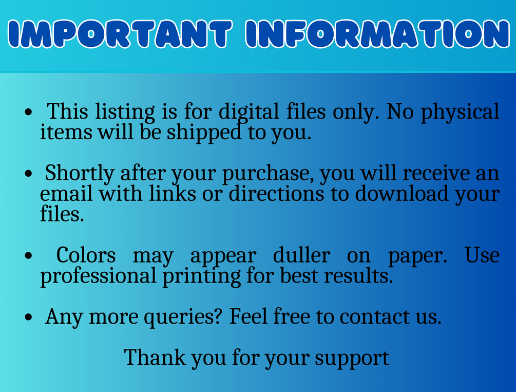 Colors may slightly vary from what you see on screen vs the printed product. Use professional printing for best results.