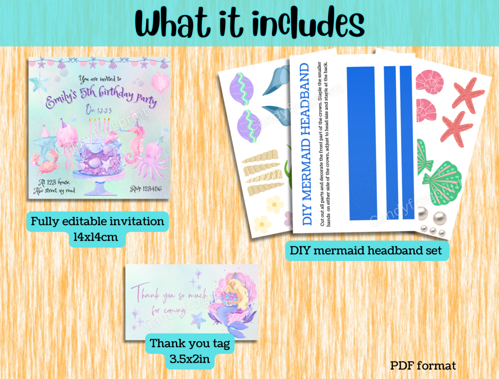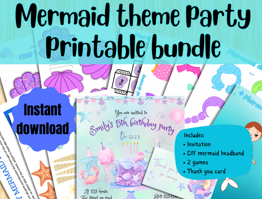 Printable birthday bundle consisting of : Invitation (editable), DIY mermaid headband, Party game 1, Party game 2 , Thank you tag