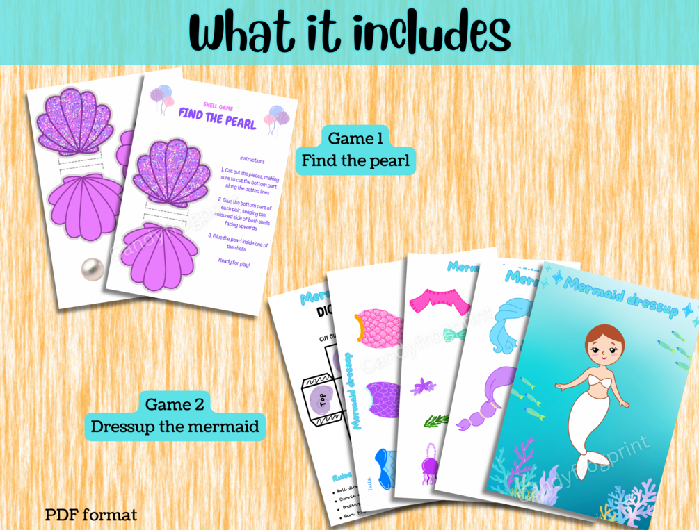 🐚 1 PDF file containing game ‘Decorate a mermaid’ with one base page, three pages of decorative elements and one dice template page (A4 size)