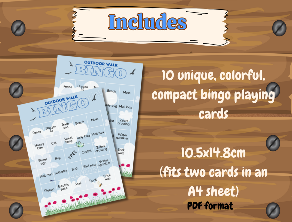 While this set does include calling cards to play regular bingo, we have put thought into including items that are actually spottable outside, so you can go scavenger hunting AND callout a bingo at the same time!