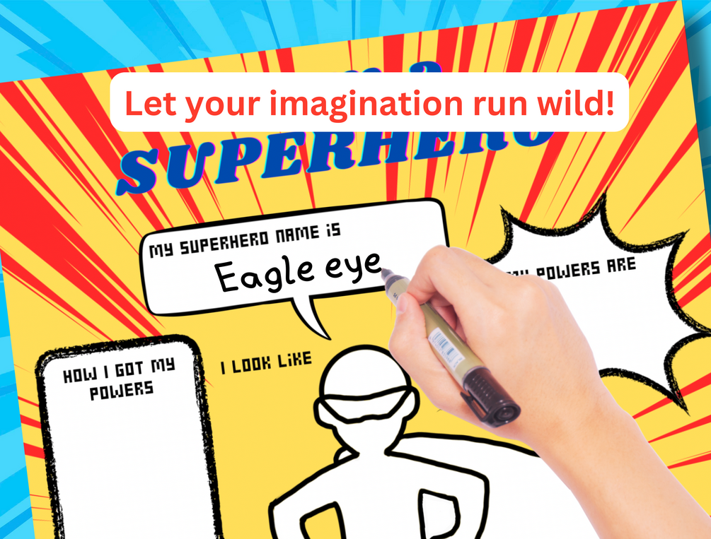 Kids get to use their imagination to describe themselves as a superhero, draw and color their own costume.