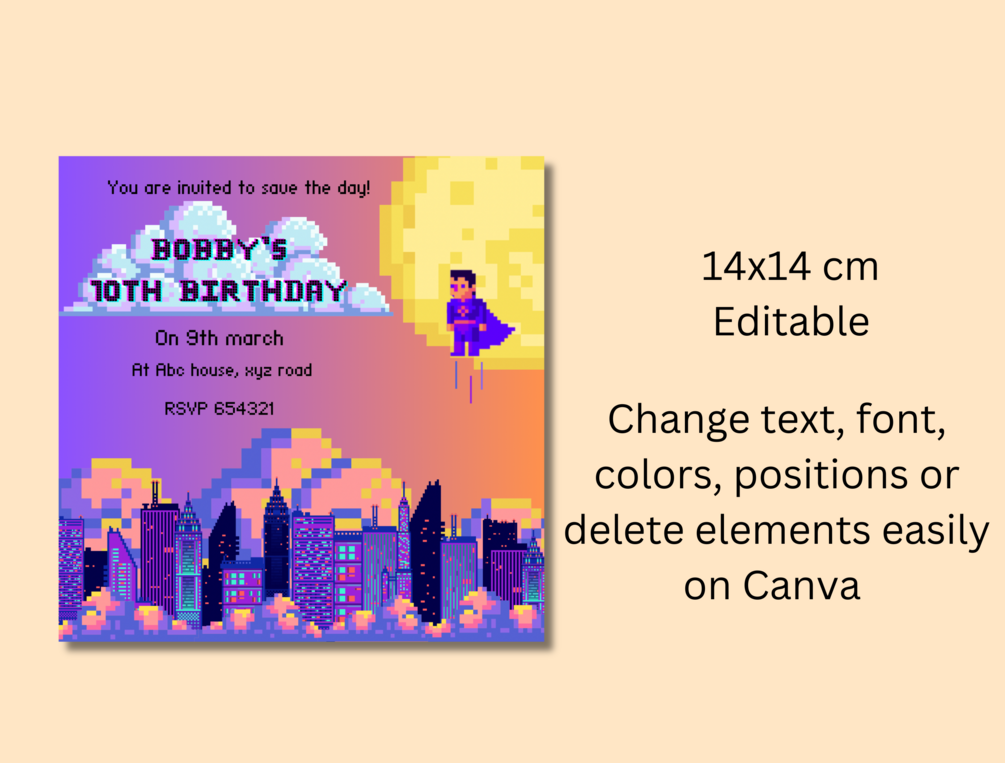 Editable invitation for boys birthday parties, superhero theme. Edit on Canva.com by signing in with your email.
